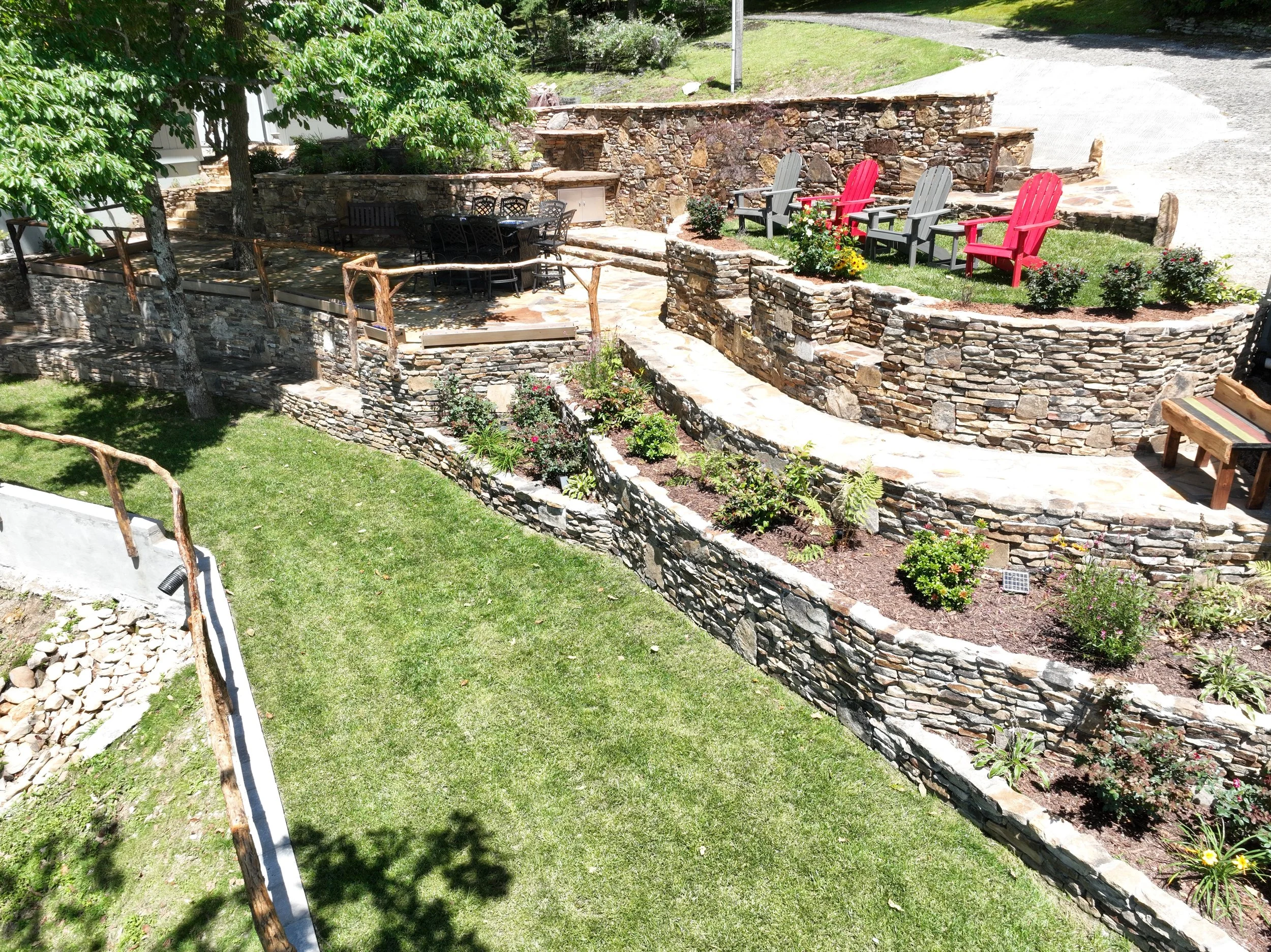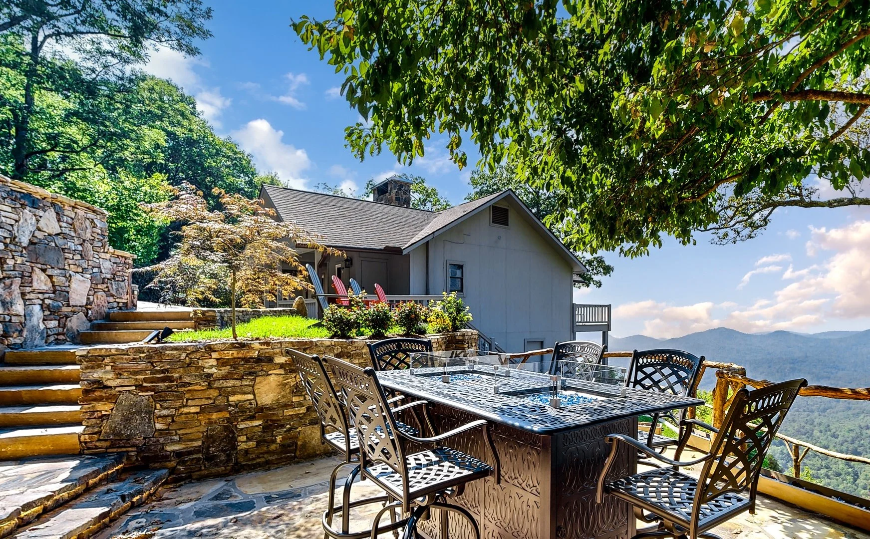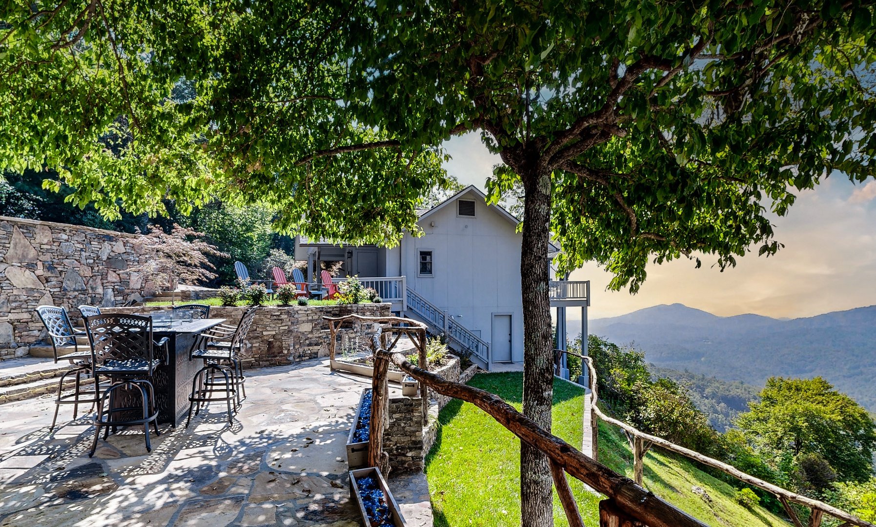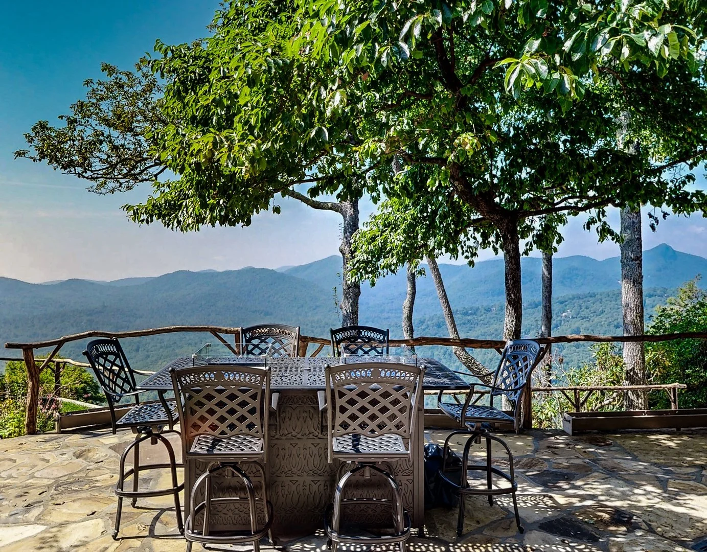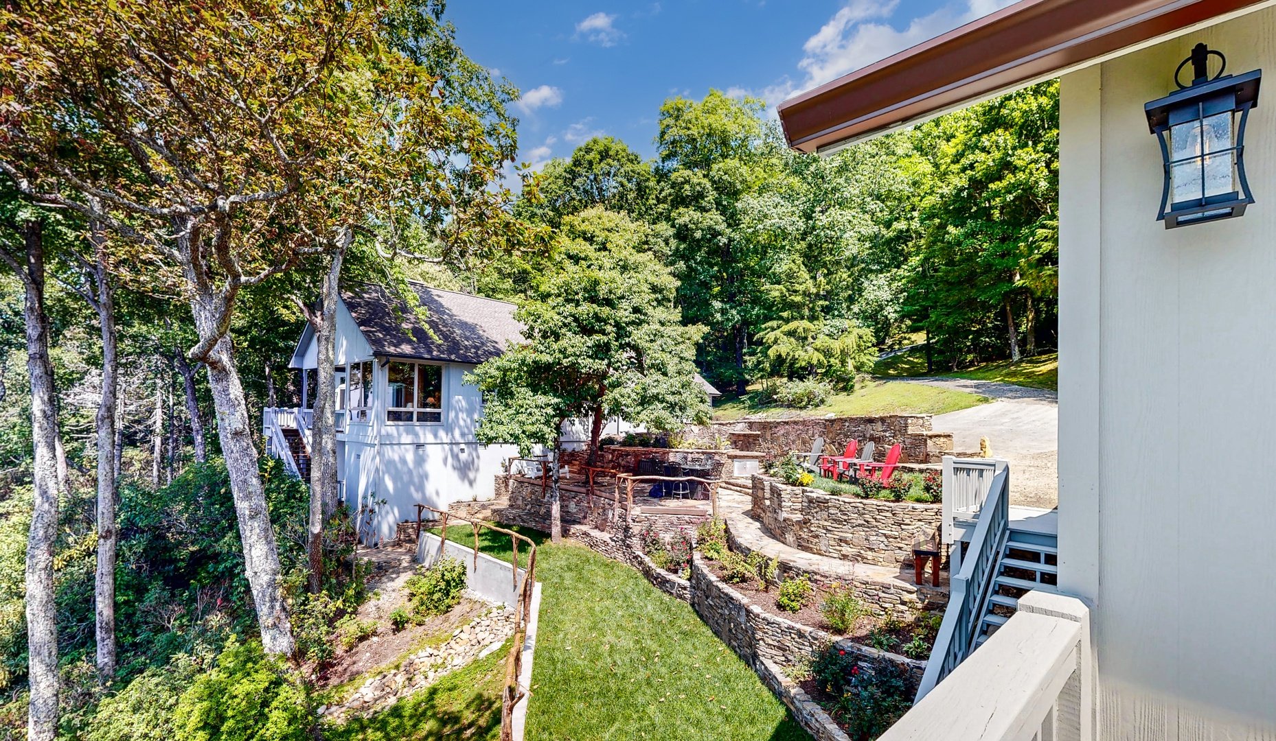 This 10-month project magically transformed (see the before and after pics below) the space between Darby and Rose cottages with Tennessee fieldstone and native landscaping, with incredible attention to detail, to create the ultimate outdoor oasis. Drink in the mountain air at an 8-person fire-table looking out over a 180+ degree panoramic view of Sapphire Valley ~ enjoying a truly unique experience at 4500 feet with gorgeous views from South Carolina up through the Highlands-Cashiers Plateau. Or find your special nook under a shady tree or gaze up at a stary night reclining on an Adirondack chair, or cozy-up into a built-in stone “throne” overlooking the valley below.